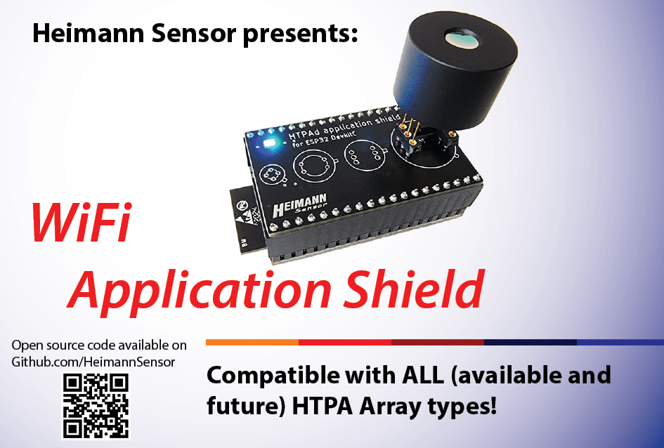 At the time we made our first Application Sets that allow quick evaluation of array sensors and ease development efforts, the sets needed a power supply unit connected to a wall socket. This made it diffictul to use our sensor in various testing environments like outdoors or in places with no available sockets. The subsequent generation was already able to supply power over USB with Ethernet communication. Hence, just a notebook was needed and more flexibility guaranteed. Nevertheless, connecting two cables could result in messy setups. That is why we launched a new USB Application Set with power AND communcation provided with just one USB cable. For the next step of development, our aim was to create a set without cables to make the SDK a versatile tool for development and sensor evaluation. This became possible through the emerge of new ESP32-DEVKITC-32D boards with WiFi connectivity which are available - seperately - on a budget (<10 USD: https://www.digikey.de/en/products/detail/espressif-systems/ESP32-DEVKITC-32D/9356990). Hand in hand with our new Application Shield and corresponding source code, it is possible to connect ALL array sensors WIRELESS to our ArraySoft v2 GUI and show realtime thermal images. From 8x8, 16x16, 32x32, 60x40, 80x64, 84x60 and 120x84 to all future generations this will be possible with just one add-on board. If you are interested in this new Application Shield , just send a message to sales@heimannsensor.com .